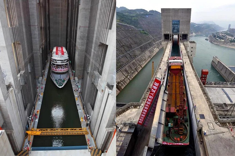 三峽升船機(左)是目前世界上技術難度和規模最大的升船機,向家壩升船機(右)是目前世界上已投入運行中提升高度最大的升船機