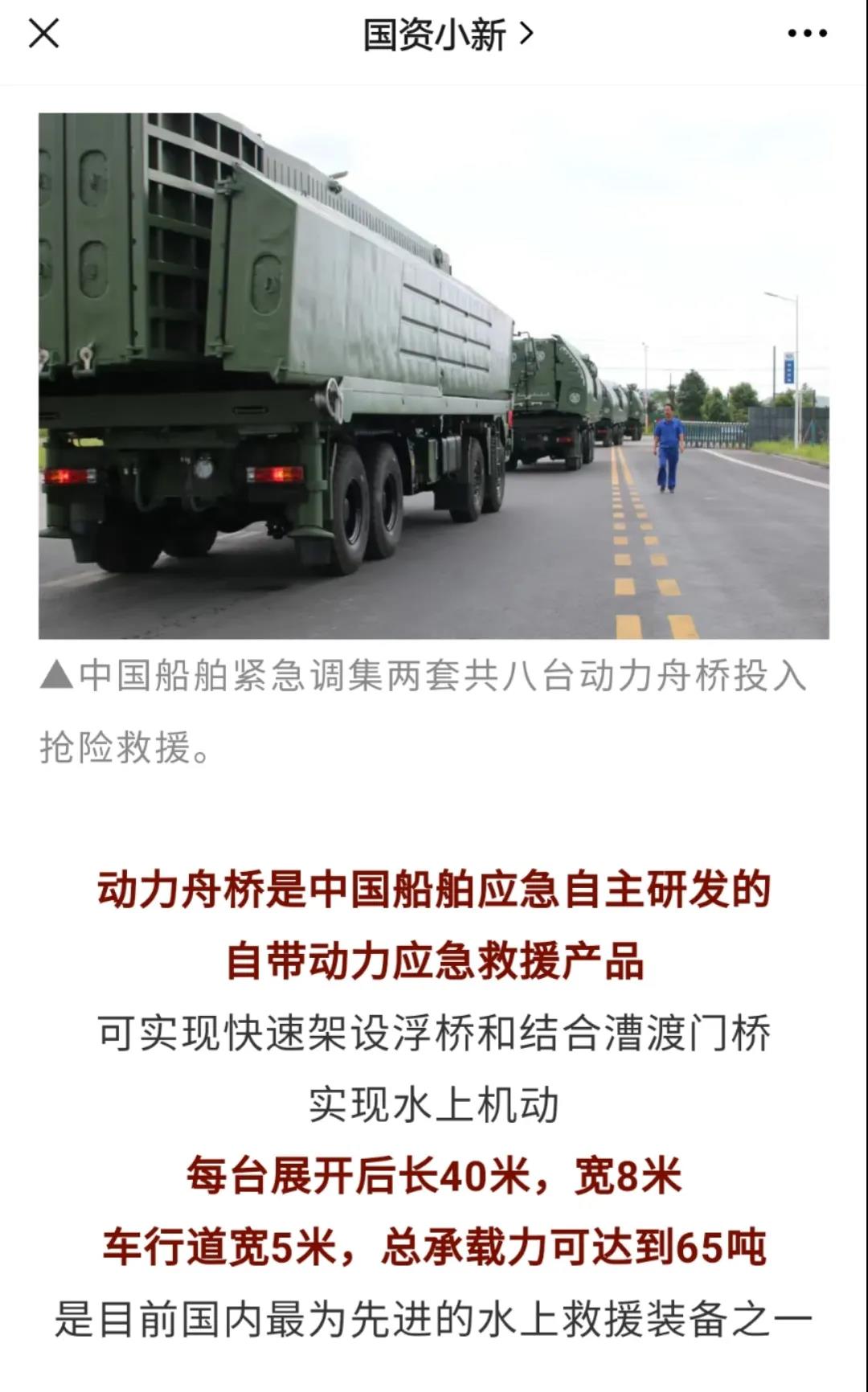 在本次搶險救援任務中,中船應急制造的應急動力舟橋被稱作“救援航母”,先后被多家媒體報道多次霸屏。
