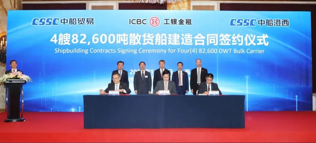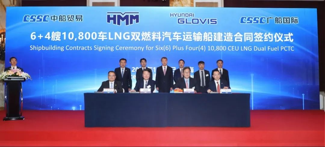 簽約儀式上,外高橋造船、中船貿易與Seaspan、現代Glovis簽署了6+4艘10800車LNG雙燃料PCTC船項目;廣船國際、中船貿易與HMM、現代Glovis簽署了6+4艘10800車LNG雙燃料PCTC船項目;北海造船、中船貿易與北銀金租、山東海運簽署了4艘325000噸超?型甲醇雙燃料礦砂船項目;江南造船、中船貿易與太平洋氣體簽署了3艘99000方VLEC船項目;黃埔文沖、中船貿易與Benelux公司簽署了2+1艘48000方LPG船項目;中船澄西、中船貿易與工銀金租簽署了4艘82600噸散貨船項目;大連造船與七二五所青島雙瑞簽署了15000TEU集裝箱船甲醇供應系統項目。