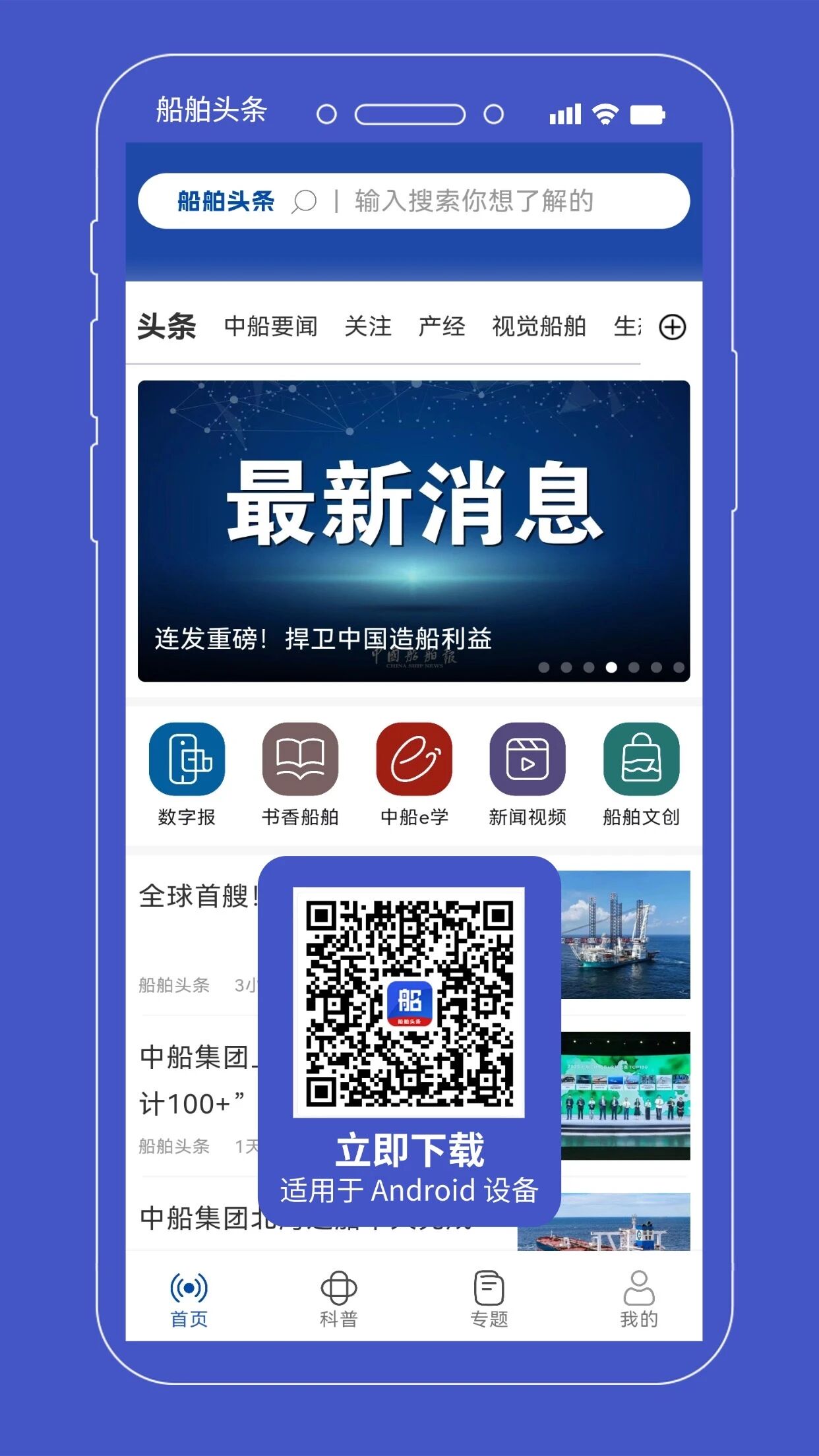 “船舶頭條”App聚焦海洋裝備產業鏈,集新聞發布、融合傳播、專業解讀、科普宣傳、企業智庫、服務聚合等功能為一體,設有“頭條”“中船要聞”“關注”“產經”“視覺船舶”“生態圈”6個精品頻道以及“科普”“專題”等功能版塊,并鏈接“書香船舶”“《中國船舶報》數字報”“中船e學”“新聞視頻”“船舶文創”等多個服務端口,目前支持安卓系統下載使用。