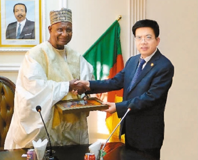 陜西建工集團(tuán)黨委書記、董事長、總經(jīng)理張義光(右)拜會喀麥隆旅游部長貝洛?布巴?邁加里先生(藺進(jìn)士 攝)