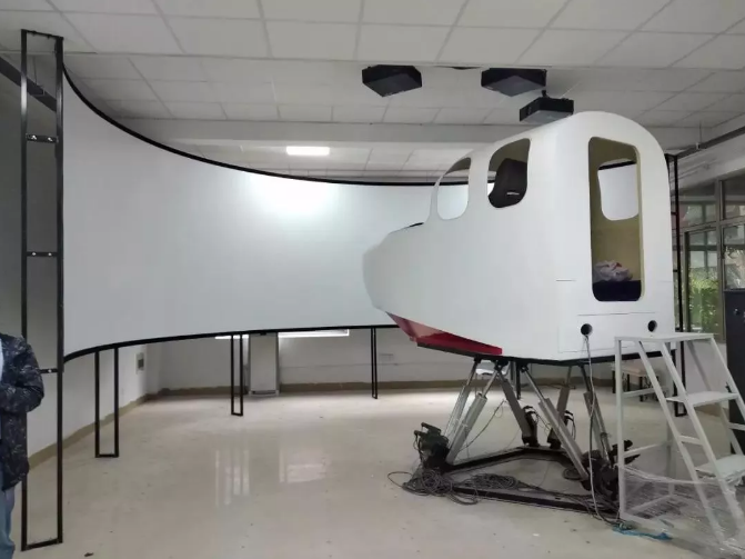 ????該平臺主要由地效翼船駕駛艙、六自由度運(yùn)動平臺、工控機(jī)、激光高清工程投影機(jī)、180°金屬環(huán)形硬幕、圖像處理器、飛行仿真軟件等組成。駕駛座艙1:1復(fù)制交通運(yùn)輸部指定的唯一教具——翔州1型地效翼船,在環(huán)境上保持了與真實地效翼船的高度一致,180°金屬環(huán)形硬幕最大程度再現(xiàn)全球各大水域的真實場景,而六自由度運(yùn)動平臺真實實現(xiàn)了地效翼船升沉、俯仰、滾轉(zhuǎn)等動作,給學(xué)員身臨其境的地效翼船駕控感受。
