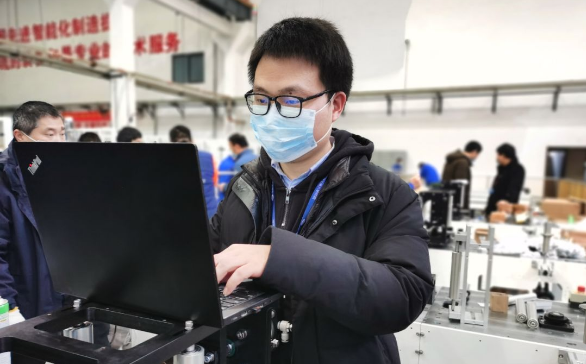 ????徐存培是平面口罩機項目的技術負責人。自接到平面口罩機研制任務以來,他幾乎就“長”在公司里了。他穿梭在各臺平面口罩機間,一會兒墊腳測量放料架距離地面的高度,一會兒彎腰擰緊設備柜里的螺絲,一會兒又緊盯著傳送帶,看無紡布貼合的角度是否精準無誤……