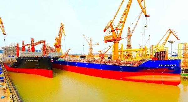 ????4月10日,中國船舶集團(tuán)旗下黃埔文沖為希臘COSMOSHOP公司建造的1500TEU.GO集裝箱船4號船H5655船以及為新加坡太古公司建造的2350TEU.C集裝箱船4號船H5529船