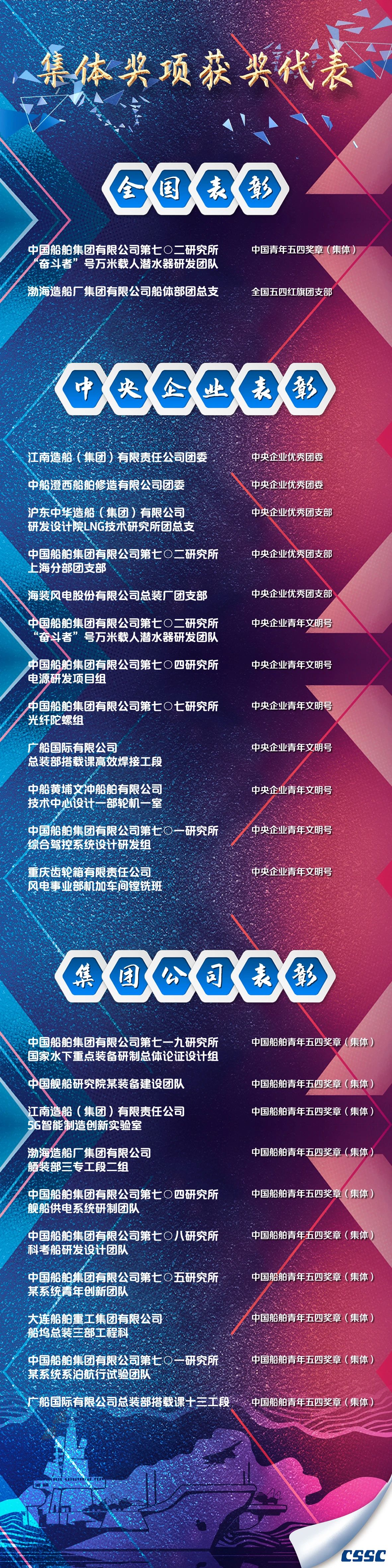 有的在生產一線不畏艱難、埋頭苦干,有的在服務集團發展的最基層不計得失、任勞任怨。他們把個人理想融入世界一流船舶集團的偉大事業中,書寫著新時代的青春答卷,彰顯著新時代青年的責任與擔當,為船舶青年作出了榜樣,樹立了標桿。