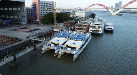 2020年12月30日,中國(guó)船舶集團(tuán)旗下遠(yuǎn)舟公司所屬英輝南方造船(廣州番禺)有限公司建造的“新海韻”號(hào)、“新海駿”號(hào)兩艘鋁合金雙體高速客船,同時(shí)在廣州市番禺區(qū)英輝南方碼頭順利交付。“新海韻”、“新海駿”是英輝南方為船東建造的藍(lán)色干線(xiàn)系列高速客船的第8和第9艘,船長(zhǎng)42.8米,寬10.3米,載客199人,設(shè)計(jì)航速35節(jié)。遠(yuǎn)舟公司所屬英輝南方在鋁合金高速客船第三代船型基礎(chǔ)上,開(kāi)展技術(shù)創(chuàng)新和船型優(yōu)化,開(kāi)發(fā)完成了“新海韻”、“新海駿”為代表的第四代新船型。