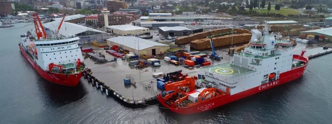 ????當地時間11月7日上午,搭載107名中國第36次南極考察隊員的“雪龍”號停靠澳大利亞霍巴特港口,與先行靠港的“雪龍2”號正式匯合。