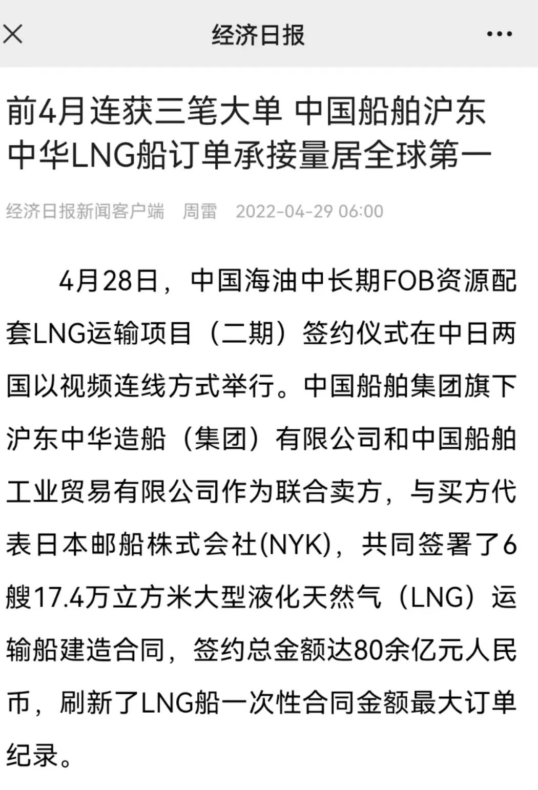 4月28日,中國海油中長期FOB資源配套LNG運輸項目(二期)簽約儀式,在中國北京、天津、深圳、上海和日本東京以視頻連線方式成功舉行。中國船舶集團有限公司旗下滬東中華和中船貿易作為聯合賣方,與買方代表日本郵船株式會社(NYK),共同簽署6艘17.4萬立方米大型液化天然氣(LNG)運輸船建造合同。